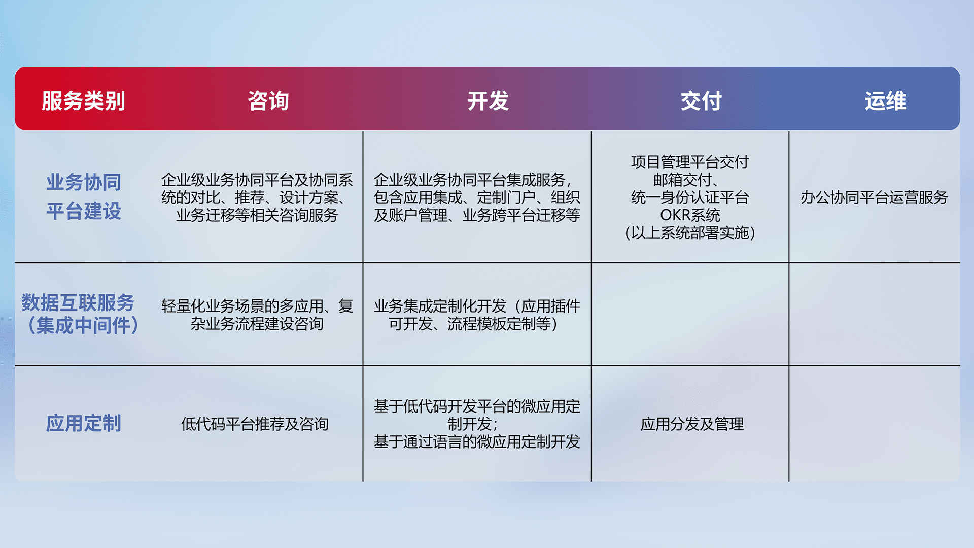 针对钉钉、、、、企微、、、、IDaas等平台级产品提供产品的规划、、方案、、、交付、、、定制化开发等服务,,,,实现如统一协同办公、、、智能客户服务、、、、混合会议管理、、、智能数据查询、、等业务场景,,,实现数字化转型。。。